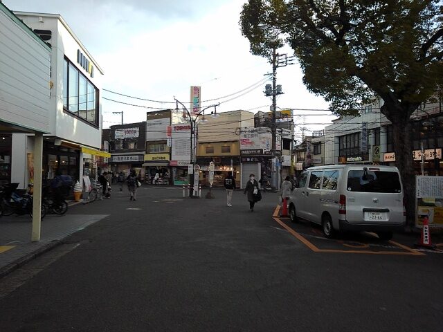 夕暮れの駅前。暖色の灯が人々を迎える。駅名の由来となった矢向町はオレが生まれた1969年に廃止されているとのこと。