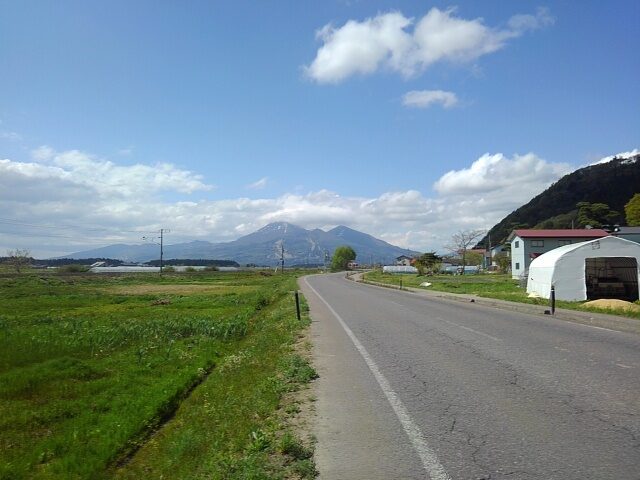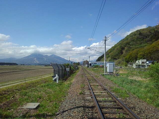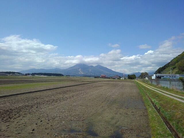 何気ない踏切で振り返ると声を上げた。鉄路の先には磐梯山。まさに絶景。山頂には雲がかかっている。こんなに晴れたが、明日はまた崩れるのか。
