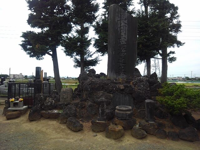 国定忠治の墓は柵に囲われ、墓地の中央に大きな石碑を従えてこじんまりと立っている。