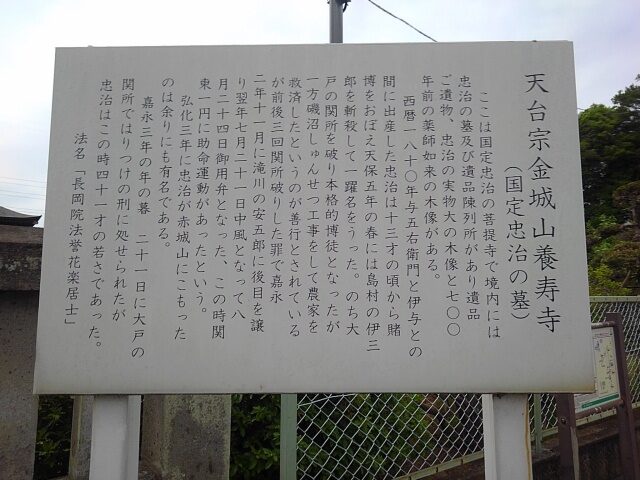 10代で人を殺し無宿となり、以来関所破りをはじめ数々の罪を犯したものの、天保の飢饉に苦しむ民への施しがあったとの伝説を持ち、芝居に描かれる。