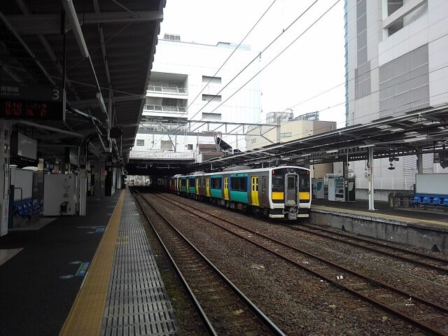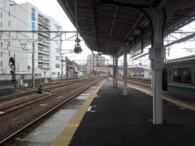6分の停車。特急列車が東京方面に去り、13分発の水戸線小山行も出た。