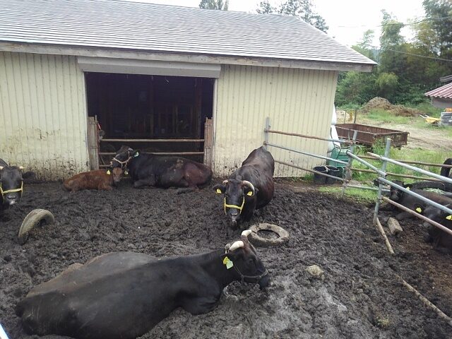 牛舎では子牛をあやす母牛や、哲学的な目を向けてくる雄牛を愛し、水田に映る空を写した。