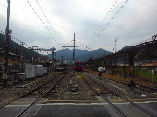 雨は弱まり、ここで行き違い2分の停車。すでに上り列車は入線している。