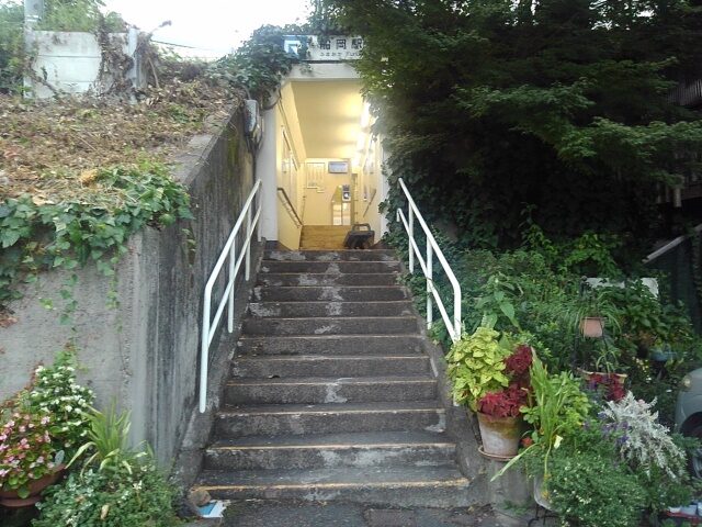 ホームに穴が開いたような階段を下りると、外界に続く狭い田舎道。そこが駅の入口。光を放つ駅は、まるで異界の入口。