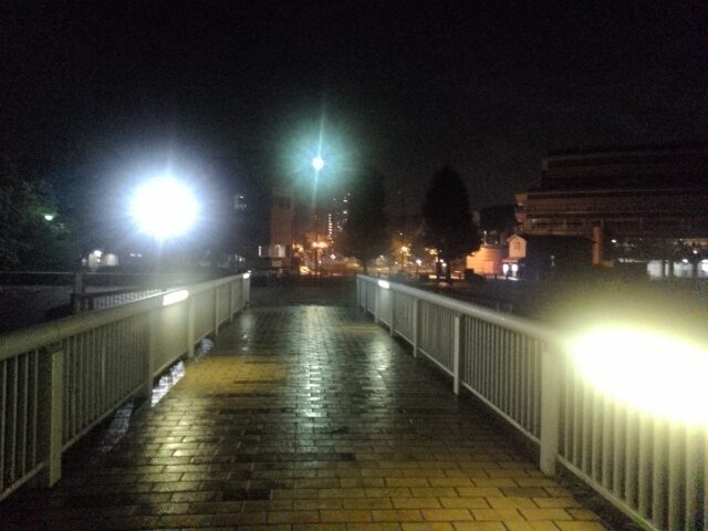 昨夜、大津駅に19:25に着いている。街路には濡れたあと。駅ビルじゃビヤガーデンの傘が開いている。