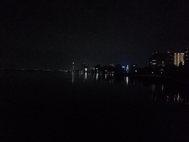 京阪電車の踏切を渡り、左手に琵琶湖ホテル。暗い湖面の真ん中に桟橋が光っている。なるほどこんなものがあったか。