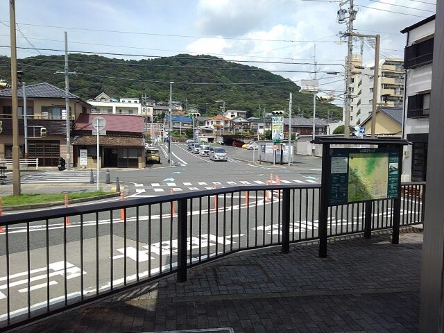 反対側の出口には動植物公園。駅前には恐竜を緑で象ったオブジェが立ち、遠くに観覧車が見える。