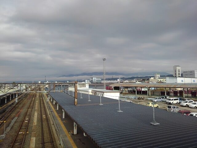 会津若松駅には日差しがあり、磐梯山は雲に隠れている。2年半振りになるのか。